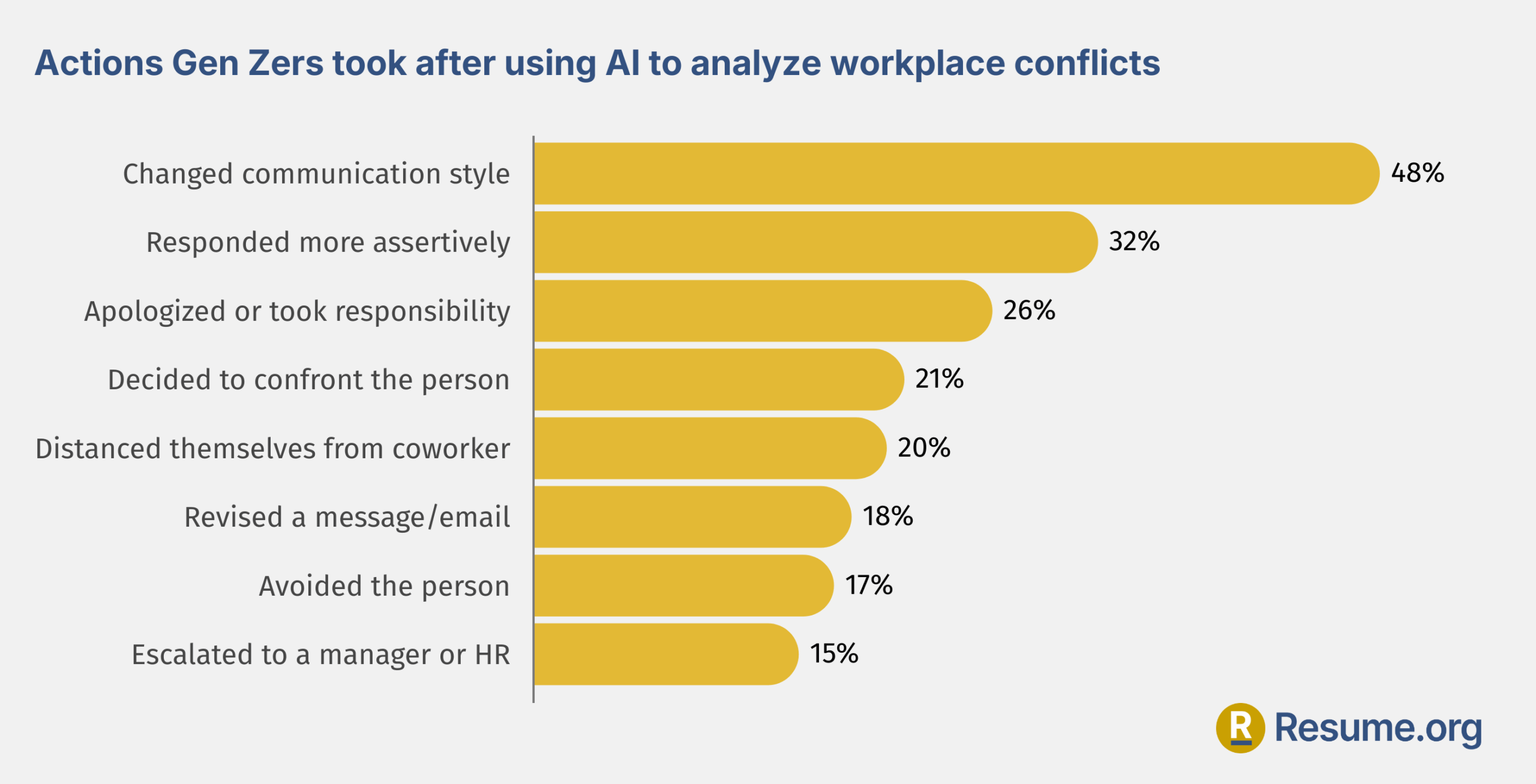 These mindset shifts often lead to behavior changes. Nearly half of Gen Z workers (48%) say they change how they communicate with other people after using AI. About 32% respond more assertively than usual, and 26% end up apologizing or taking responsibility. Roughly 21% choose to confront the person directly, while 20% distance themselves instead. Another 18% revise or decide not to send a message they had already written. A total of 17% say they avoid the person entirely, and 15% escalate the situation to a manager or HR.