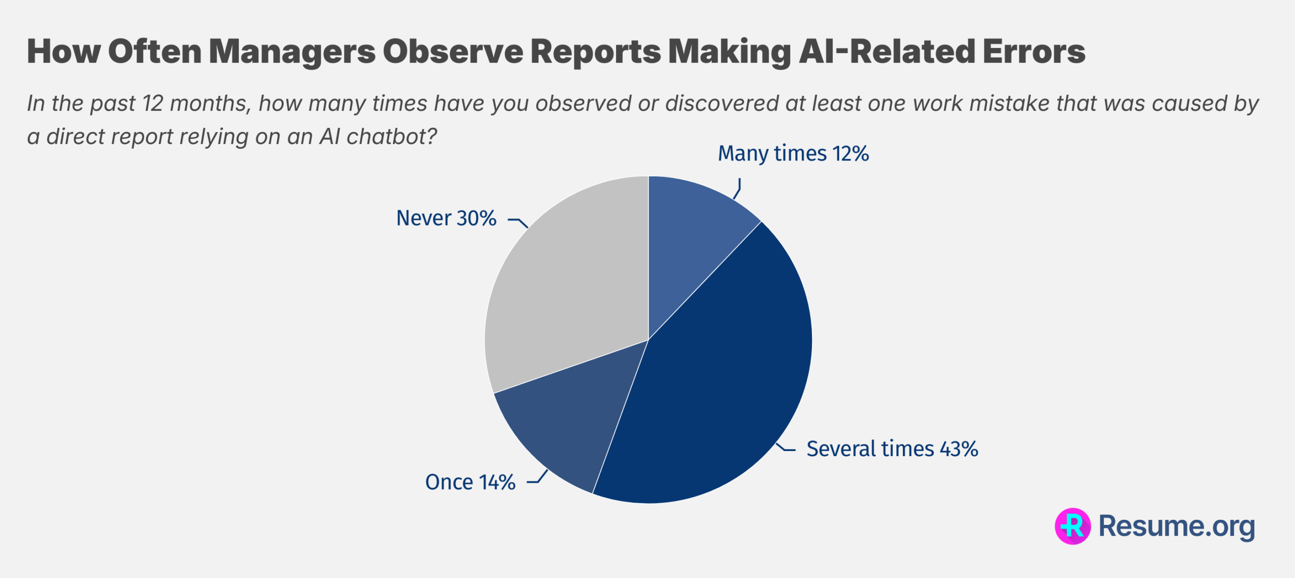 The data reveals that AI-related mistakes are far from rare. About 70% of managers reported witnessing at least one AI-related error by their direct reports in the past year. Notably, these incidents are often recurring: 12% reported seeing these mistakes many times, and 43% observed such mistakes several times. This pattern underscores that AI-related mistakes are not isolated events, but rather a persistent feature in many organizations.