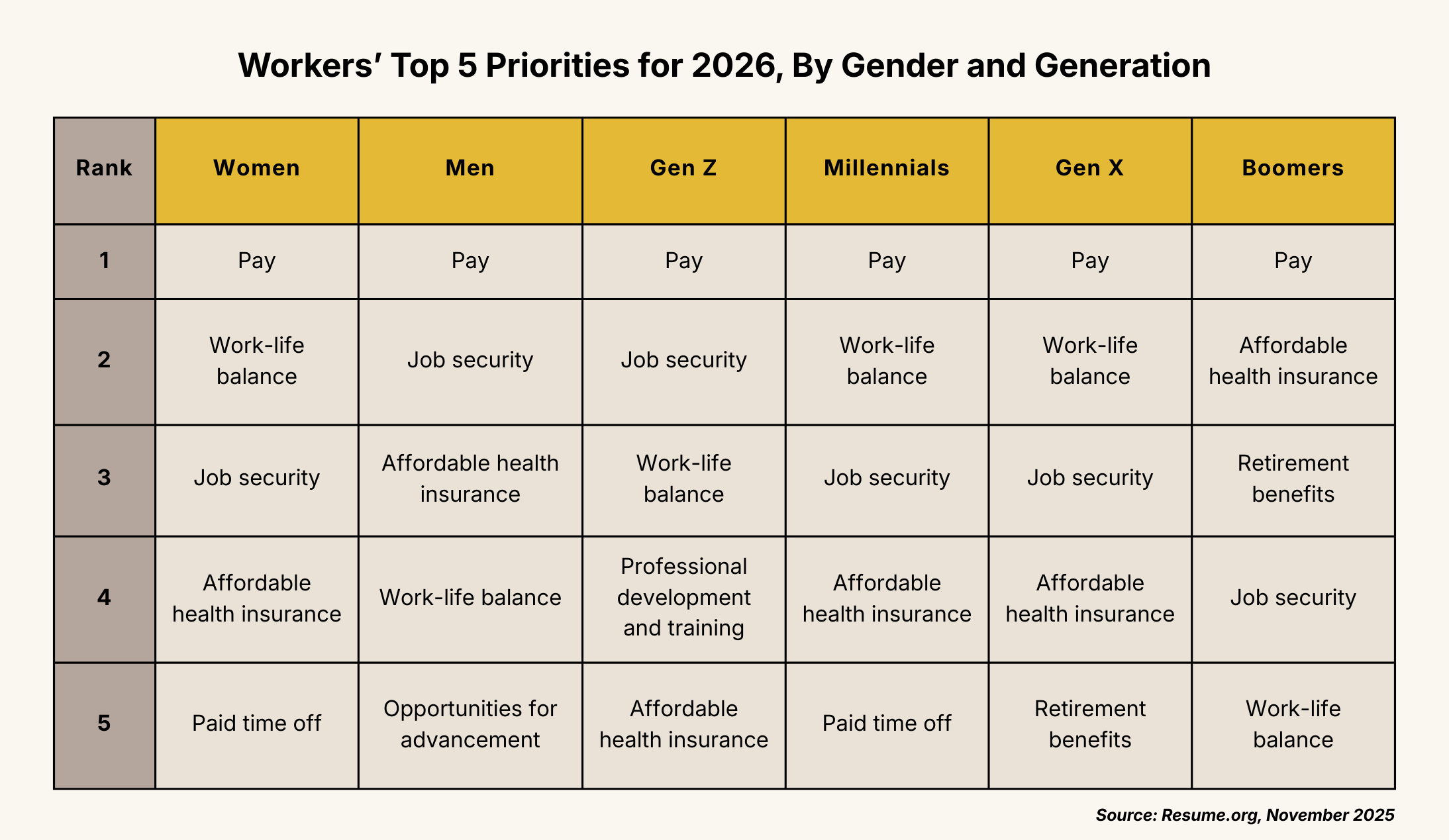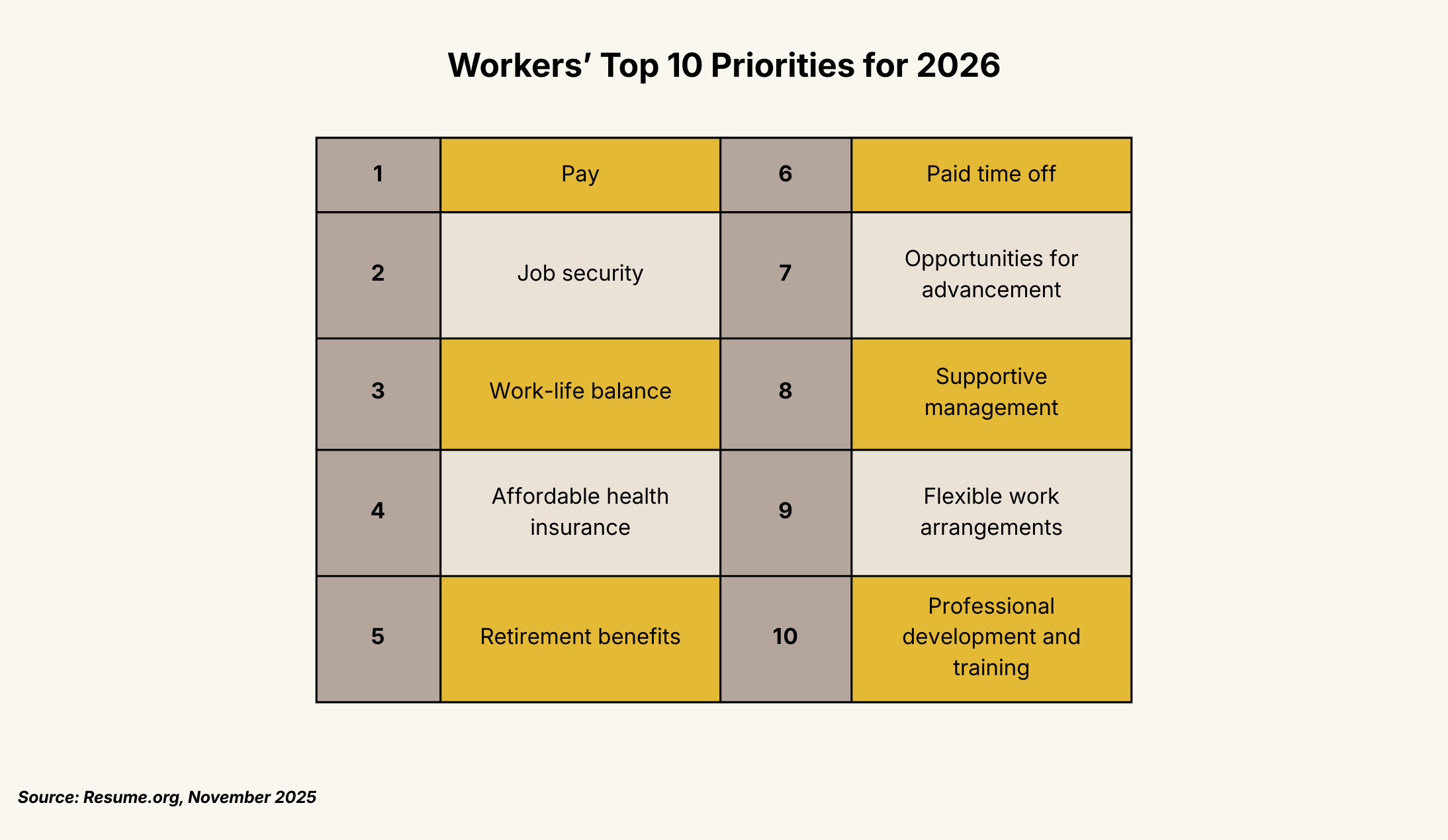 “It’s no surprise that pay, job security, and work-life balance are most important to workers in 2026,” says Kara Dennison, Head of Career Advising at Resume.org. “These priorities reflect what people need to feel stable, valued, and able to plan their lives. Pay matters because it shapes overall financial well-being as housing, healthcare, and everyday costs rise. Job security has become a bigger focus after years of layoffs and restructuring. And work-life balance remains essential as workers prioritize their health, family needs, and mental well-being. Together, these priorities show that employees want both financial stability and a work experience that feels sustainable.”