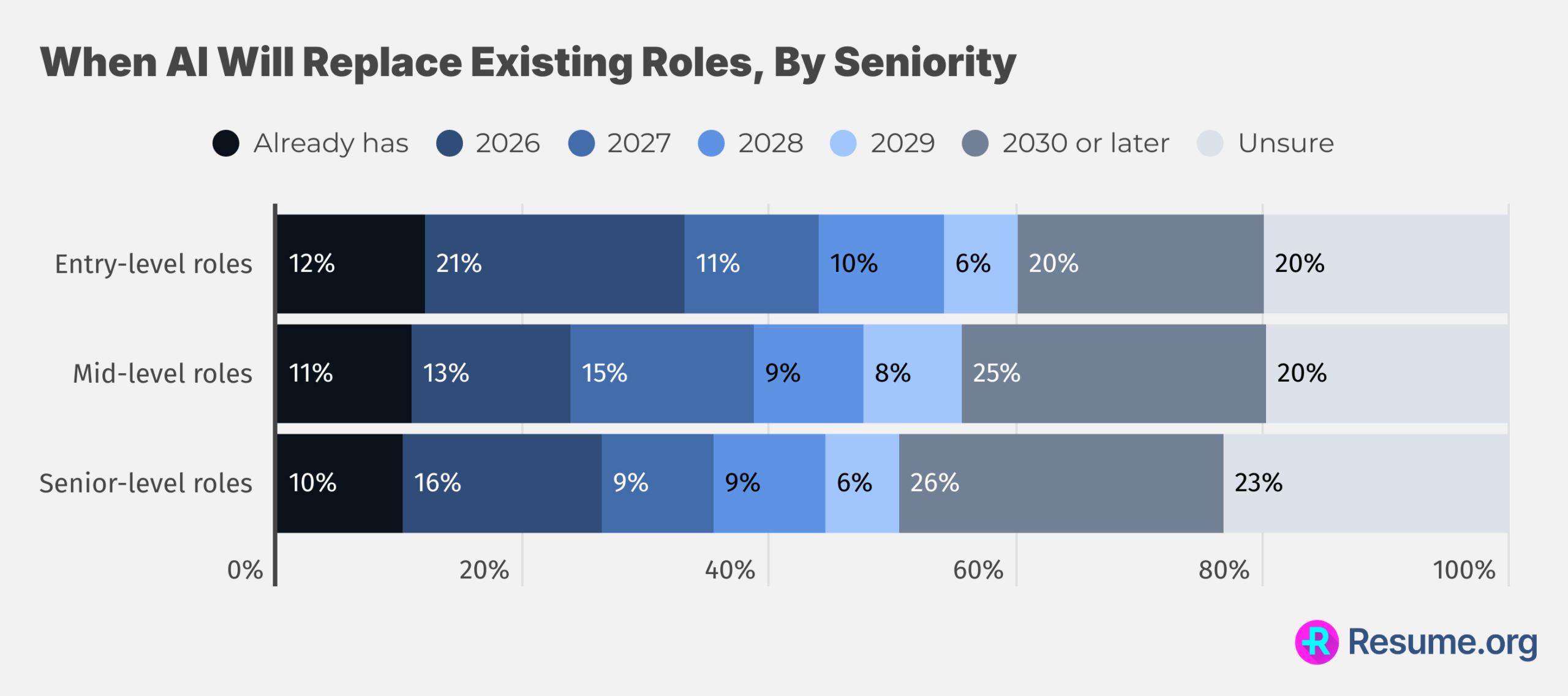 Senior and mid-level roles are not immune, though the timeline appears more extended. About 11% of companies have already eliminated mid-level roles due to AI, and 10% have done the same with senior-level positions. By year’s end, those figures are projected to reach 24% for mid-level and 26% for senior-level roles.