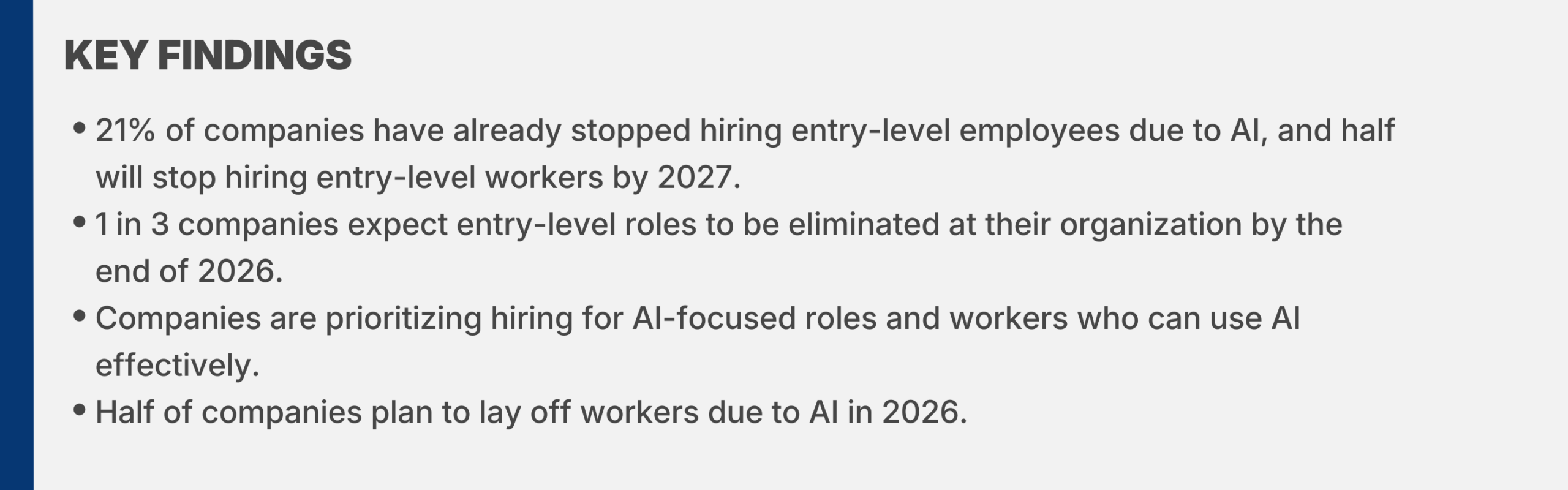 By the end of 2026, 36% of companies say they will have frozen entry-level hiring. Looking ahead one more year, nearly half (47%) expect to halt entry-level hiring by 2027.